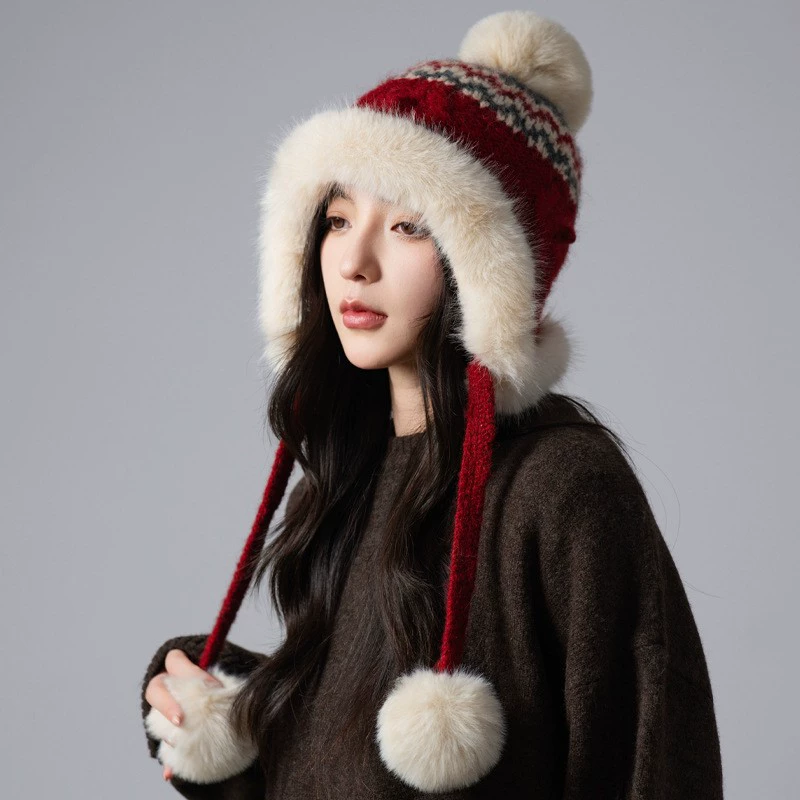 Korean style winter women's hat, cute pom pom knitted hat, large head circumference, autumn windproof head covering hat, ear protection warm hat